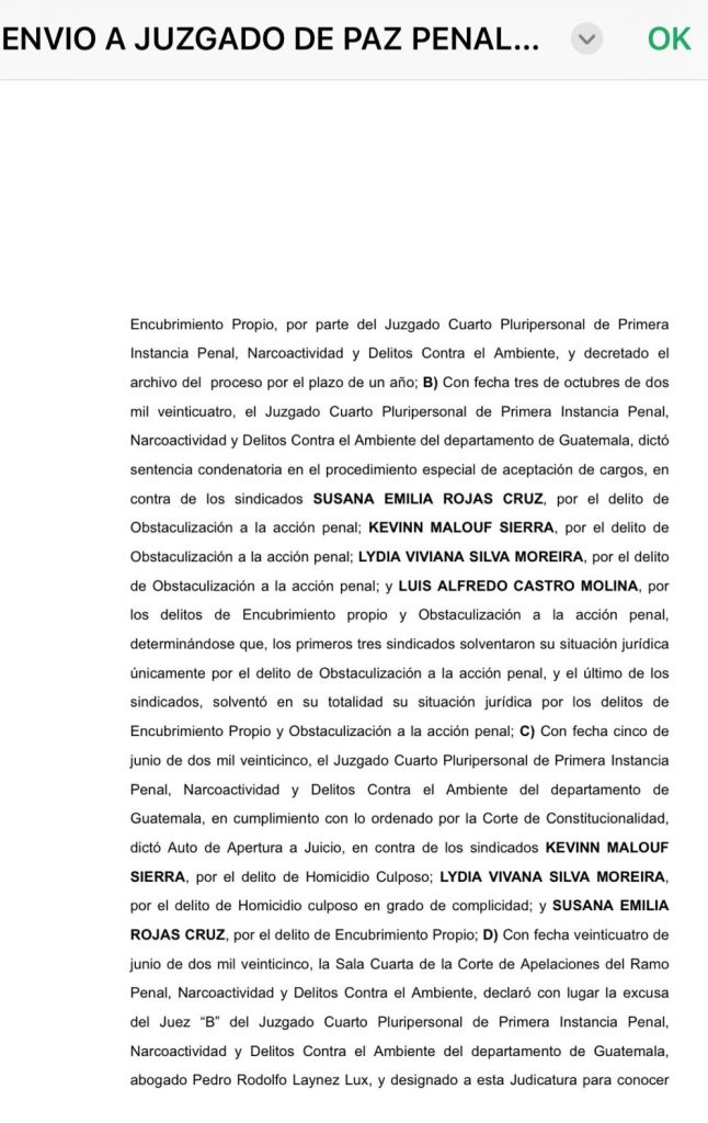 Por aparte los tribunales el doctor Kevin Malouf es beneficiado y descienden su caso a delitos menores, siendo trasladado a un juzgado de paz penal, debido a que el juzgado quinto penal se declaró incompetente para llevar el mismo, beneficiando con delitos mejores a los responsables del asesinato de Floridalma Roque.