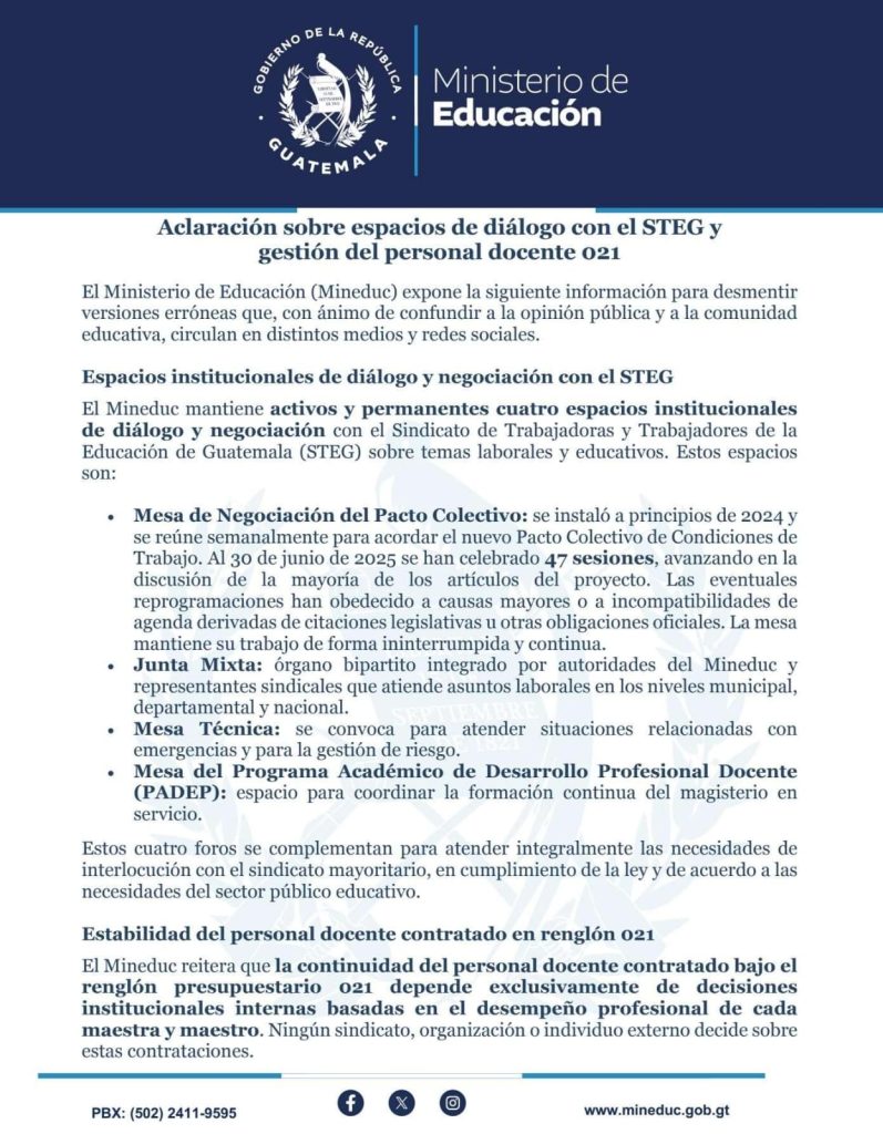 El Mineduc informó que mantiene activos y permanentes los siguientes cuatro espacios institucionales de diálogo y negociación con STEG sobre temas laborales y educativos: