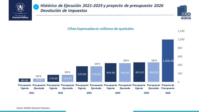 Desde la llegada de este gobierno se ha ejecutado el 100 % del monto que se nos ha asignado, por eso hemos agregado al proyecto de presupuesto mil millones de quetzales para hacer la devolución total para regresar esos impuestos que están esperando los contribuyentes.
