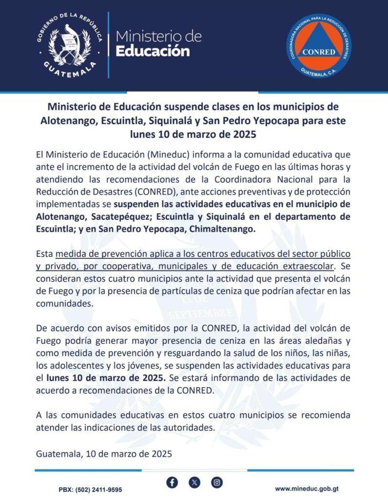 De acuerdo con avisos emitidos por la CONRED, la actividad del volcán de Fuego podría generar mayor presencia de ceniza en las áreas aledañas y como medida de prevención y resguardando la salud de los niños, las niñas, los adolescentes y los jóvenes, se suspenden las actividades educativas para el lunes 10 de marzo de 2025. Se estará informando de las actividades de acuerdo a recomendaciones de la CONRED.