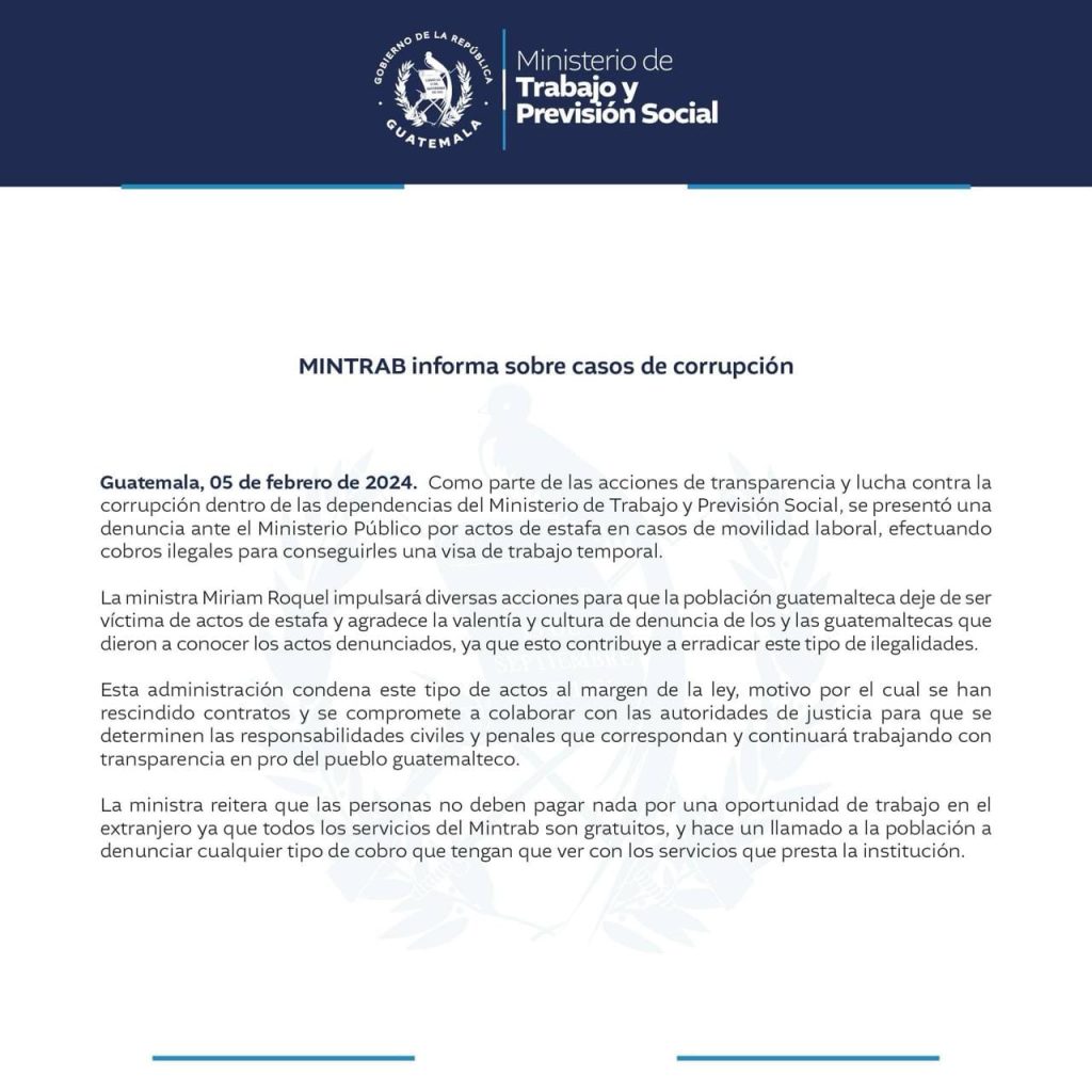 Por medio de un comunicado oficial, la cartera de trabajo detalló que esto se debe a que se estuvieron efectuado cobros ilegales ofreciendo conseguir una visa de trabajo temporal a guatemaltecos interesados en aplicar al programa.