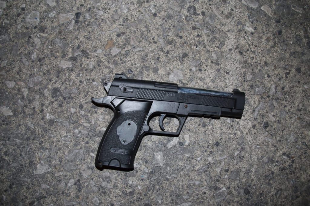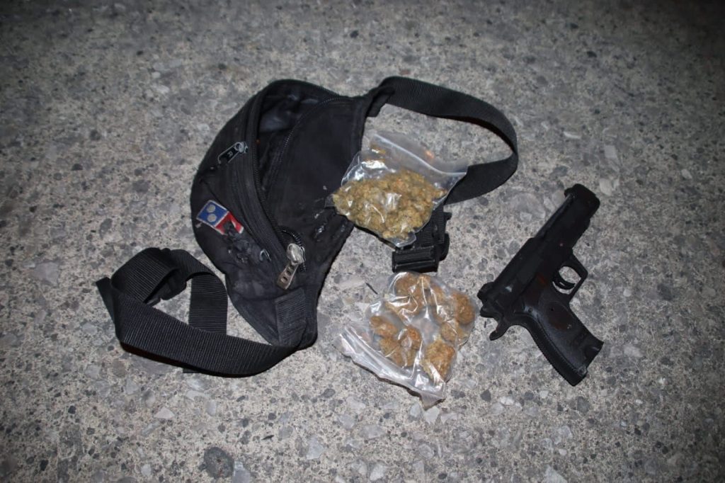 Durante la inspección, se les decomisó una mariconera donde llevaban dos bolsas con marihuana y una pistola, que resultó una réplica de arma de fuego pero de juguete, la cual utilizaban para cometer asaltos.