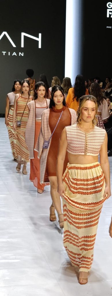 Los textiles realizados en telar de cintura creados por THIAN fueron los protagonistas, mientras las modelos desfilaban con los dispositivos Motorola como accesorio en una moderna correa y funda cruzada fabricada en cuero vegano suave y duradero.
