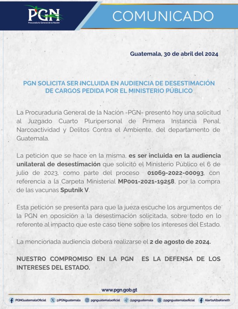 “La -PGN- presentó hoy una solicitud al Juzgado Cuarto Pluripersonal de Primera Instancia Penal para ser incluida en la audiencia unilateral de desestimación que solicitó el MP el 6 de julio de 2023, como parte del proceso 01069-2022-00093. con referencia a la Carpeta Ministerial MP001-2021-19258, por la compra de las vacunas Sputnik V.