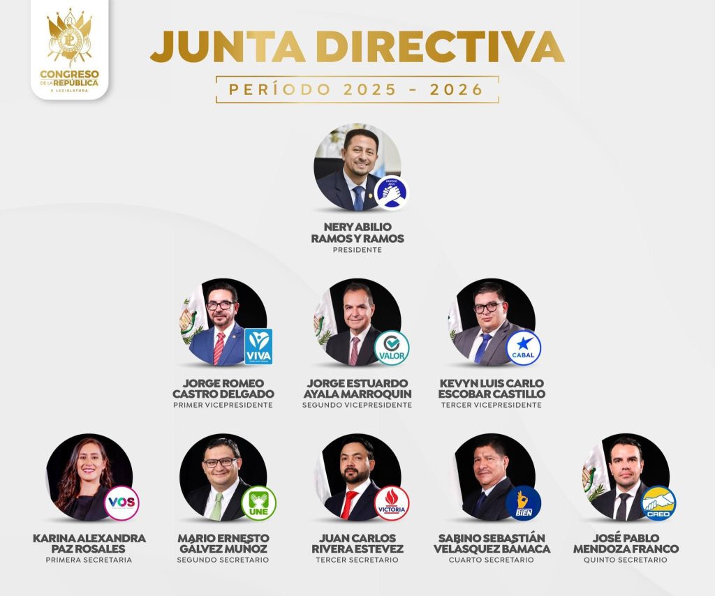 Las secretarias estarán ocupadas por Karina Paz, de VOS, que repite en el cargo de primera secretaria; Mario Gálvez, de la UNE, en la segunda; Juan Carlos Rivera, de VICTORIA, se mantiene en la tercera; Sabino Sebastián Bámaca, en la cuarta; y José Pablo Mendoza, del bloque CREO, en la quinta.