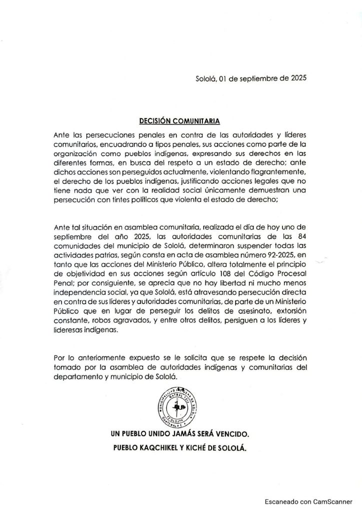 Ante tal situación en asamblea comunitaria, realizada el día de hoy uno de septiembre del año 2025, las autoridades comunitarias de las 84 comunidades del municipio de Sololá, determinaron suspender todas las actividades patrias, según consta en acta de asamblea número 92-2025, en tanto que las acciones del Ministerio Público, altera totalmente el principio de objetividad en sus acciones según artículo 108 del Código Procesal Penal; por consiguiente, se aprecia que no hay libertad ni mucho menos independencia social, ya que Sololá, está atravesando persecución directa en contra de sus líderes y autoridades comunitarias, de parte de un Ministerio Público que en lugar de perseguir los delitos de asesinato, extorsión constante, robos agravados, y entre otros delitos, persiguen a los líderes y lideresas indígenas.