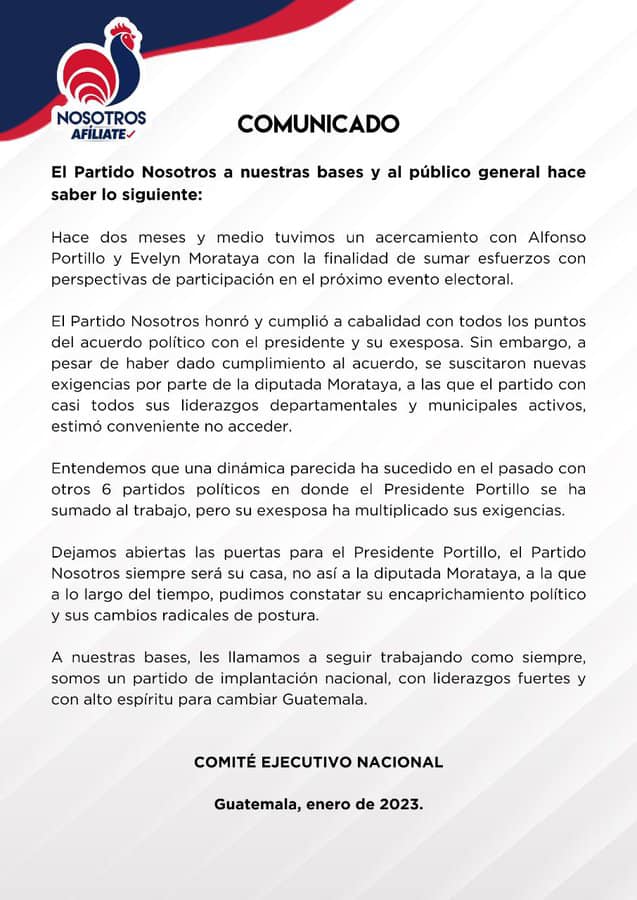 “Entendemos que una dinámica parecida ha sucedido en el pasado con otros 6 partidos políticos en donde el ex presidente Portillo se ha sumado al trabajo, pero su exesposa ha multiplicado sus exigencias”, expresa el comunicado de Nosotros.