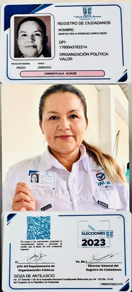 El registro de Ciudadanos del Tribunal Supremo Electoral TSE ya le entregó la credencial a la candidata a alcaldesa del Partido VALOR en el Puerto de San José Odilia Gonzalez de Rizzo con lo que ya está o Ceuta legalmente