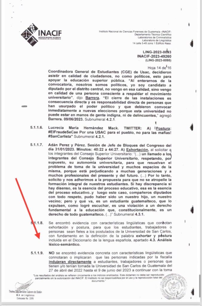 El informe de Inacif elaboró un peritaje a petición del MP por el caso «Toma Usac Botín Político», en cuyo resultado señala “no se encontró evidencia concreta con características lingüísticas que connotaras o implicaran que las personas sindicadas por la fiscalía indujeran directamente a estudiantes, trabajadores o personas que tienen o tenían tomada la USAC del 27 de abril de 2022 al 9 de junio de 2023”,