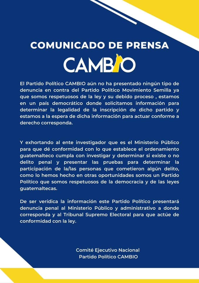 El Partido político CAMBIO, de Manuel Baldizon, que sufrió una derrota en las urnas, aseguró, por medio de un comunicado de prensa, que aún no presenta denuncia contra el partido Movimiento Semilla, sin embargo, solicita al Ministerio Público MP que investigue supuestas irregularidades.