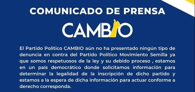 El Partido Político CAMBIO aún no ha presentado ningún tipo de denuncia en contra del Partido Político Movimiento Semilla ya que somos respetuosos de la ley y su debido proceso, estamos en un país democrático donde solicitamos información para determinar la legalidad de la inscripción de dicho partido y estamos a la espera de dicha información para actuar conforme a derecho corresponda.
