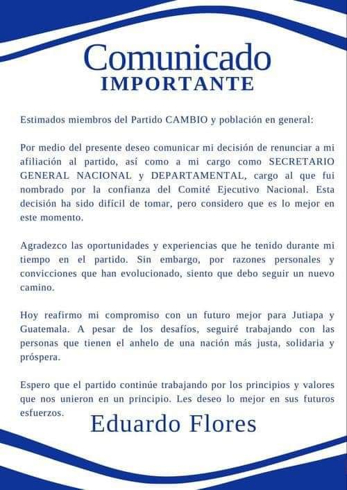 Para sorpresa de muchos el Secretario General del Partido Político CAMBIÓ Edwin Eduardo Flores Pérez renunció al Partido de los hijos de Manuel Baldizon y se desafilio al mismo