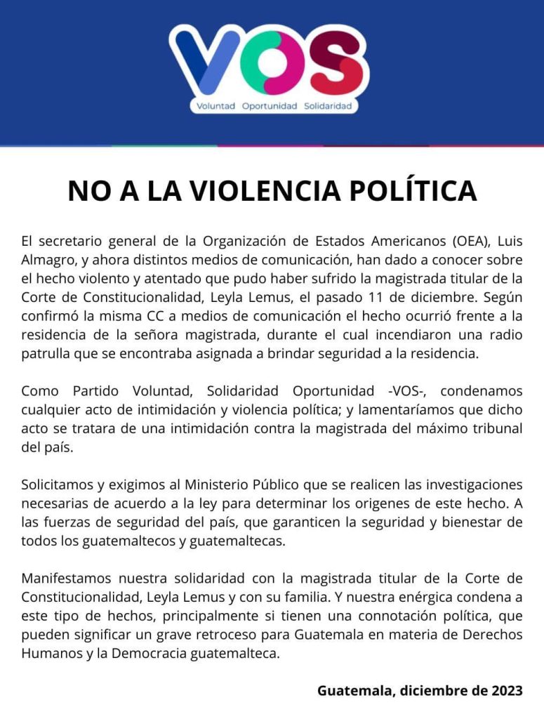 Finalmente el Partido VOS manifiesta su “solidaridad con la magistrada titular de la Corte de Constitucionalidad, Leyla Lemus y con su familia. Y nuestra enérgica condena a este tipo de hechos, principalmente si tienen una connotación política, que pueden significar un grave retroceso para Guatemala en materia de Derechos Humanos y la Democracia guatemalteca”