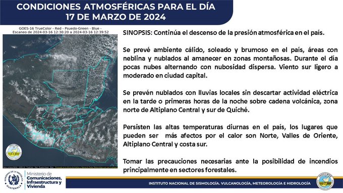 Según el pronóstico del Instituto Nacional de Sismología, Vulcanología, Meteorología e Hidrología (Insivumeh) se espera que el descenso de la presión atmosférica en el país continúe.