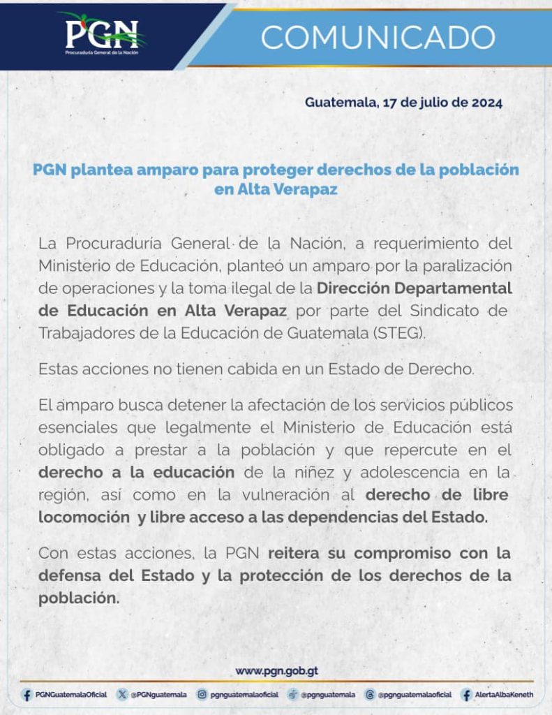En un comunicado de prensa dado a conocer la tarde de este martes indica que Procuraduría General de La Nación, a requerimiento del Ministerio de Educación, “planteó un amparo por la paralización de operaciones y la toma ilegal de la Dirección Departamental de Educación en Alta Verapaz por parte del Sindicato de Trabajadores de la Educación de Guatemala (STEG)” enfatizando que estas acciones no tienen cabida en un Estado de Derecho.