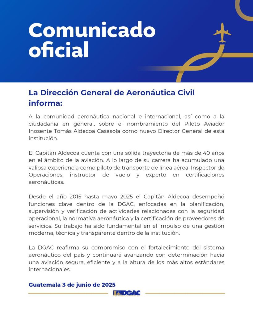 La Dirección General de Aeronáutica Civil informó esta noche que se ha nombrado al Piloto Aviador Inosente Tomás Aldecoa Casasola como su nuevo Director General de esta institución.