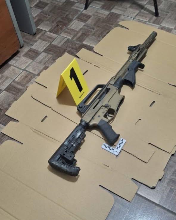 Durante la inspección al vehículo, los agentes localizaron un importante cargamento de armas y equipo táctico, compuesto por dos fusiles, una escopeta Escort Magnum, una pistola Jericho, un revólver Taurus, cinco tolvas para fusil, una tolva tipo caracol para escopeta, una tolva para pistola y 156 municiones de diverso calibre, dos chalecos antibala, un casco táctico.