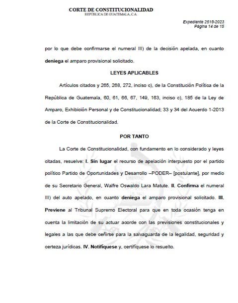 Los magistrados de la Corte de Constitucionalidad CC no aceptó la apelación presentada por el secretario general del partido PODER Walfre Lara por lo que queda fuera de la contienda electoral su binomio presidencial encabezado por Óscar Rodolfo Castañeda y Luis Adrián Ruiz