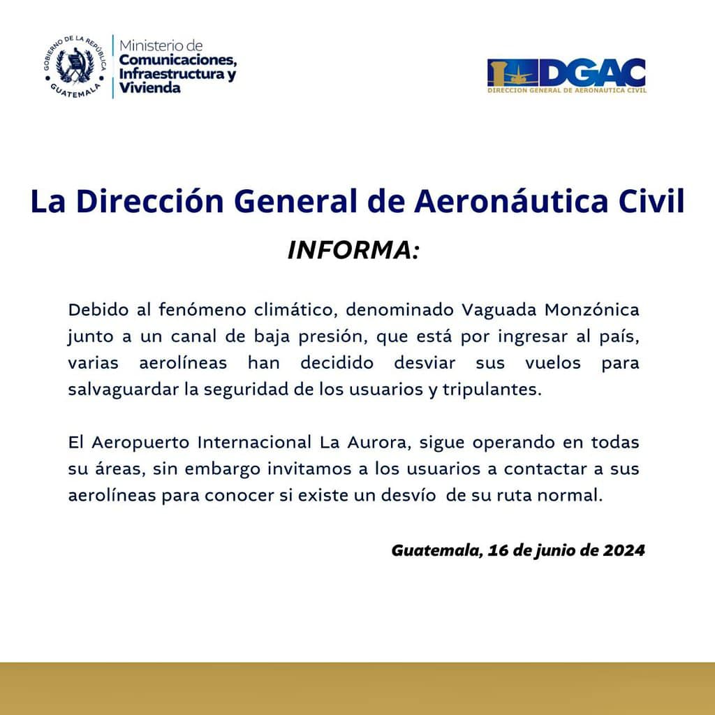 Dirección General de Aeronáutica Civil informa que debido a las condiciones climáticas de Guatemala, varias aerolíneas han desviado sus vuelos.
