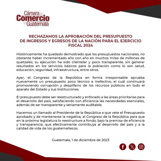 “Hacemos un llamado al presidente de la República a que vete el presupuesto aprobado y de mantenerse la negativa, al Congreso de la República para que en la próxima legislatura lo reestructure a fondo, bajo la premisa de eficiencia y transparencia, que efectivamente contribuya al desarrollo del país y a la calidad de vida de los guatemaltecos”, indica finalmente.