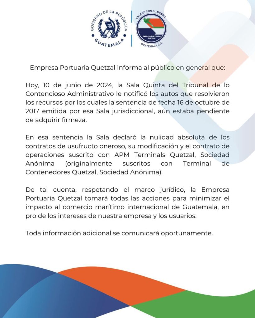 La Empresa Portuaria Quetzal EPQ fue notificada oficialmente este lunes por los tribunales de Justicia que los contrato de usufructo oneroso y el contrato de operaciones con APM Terminal Quetzal quedan nulos