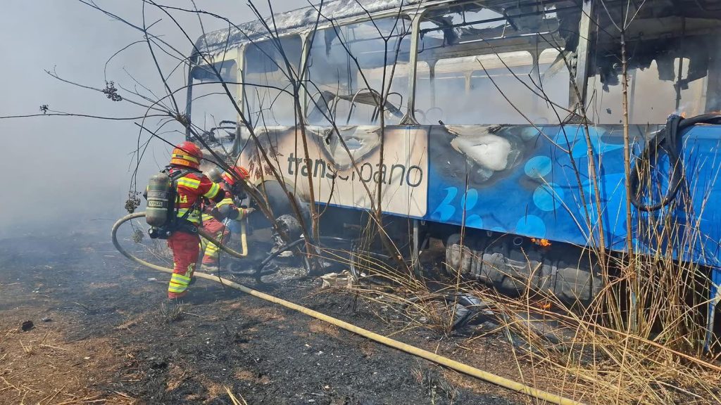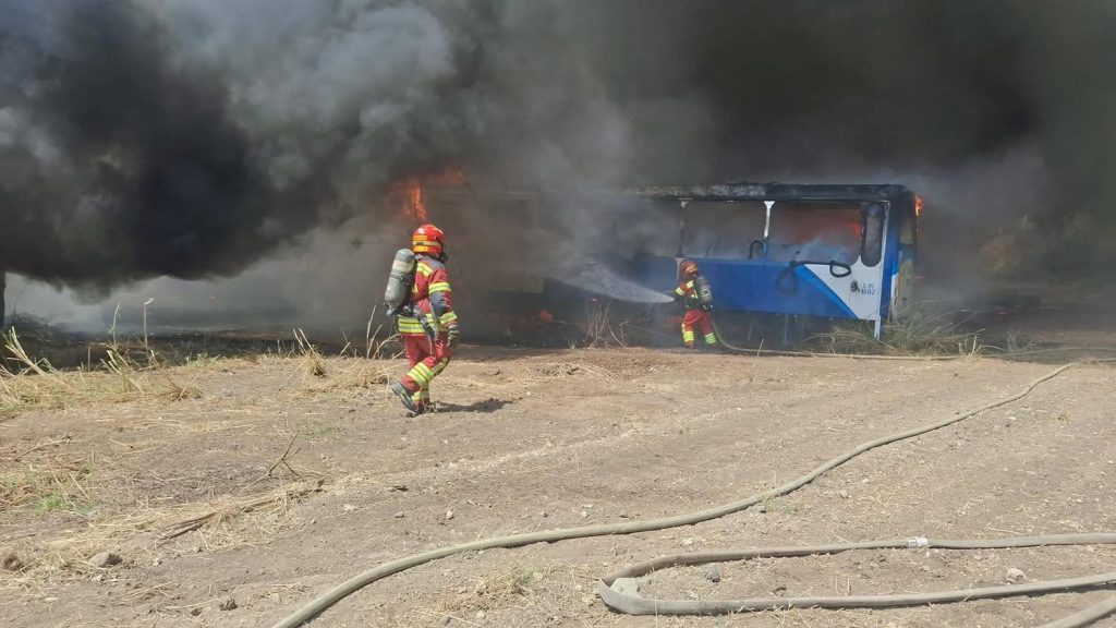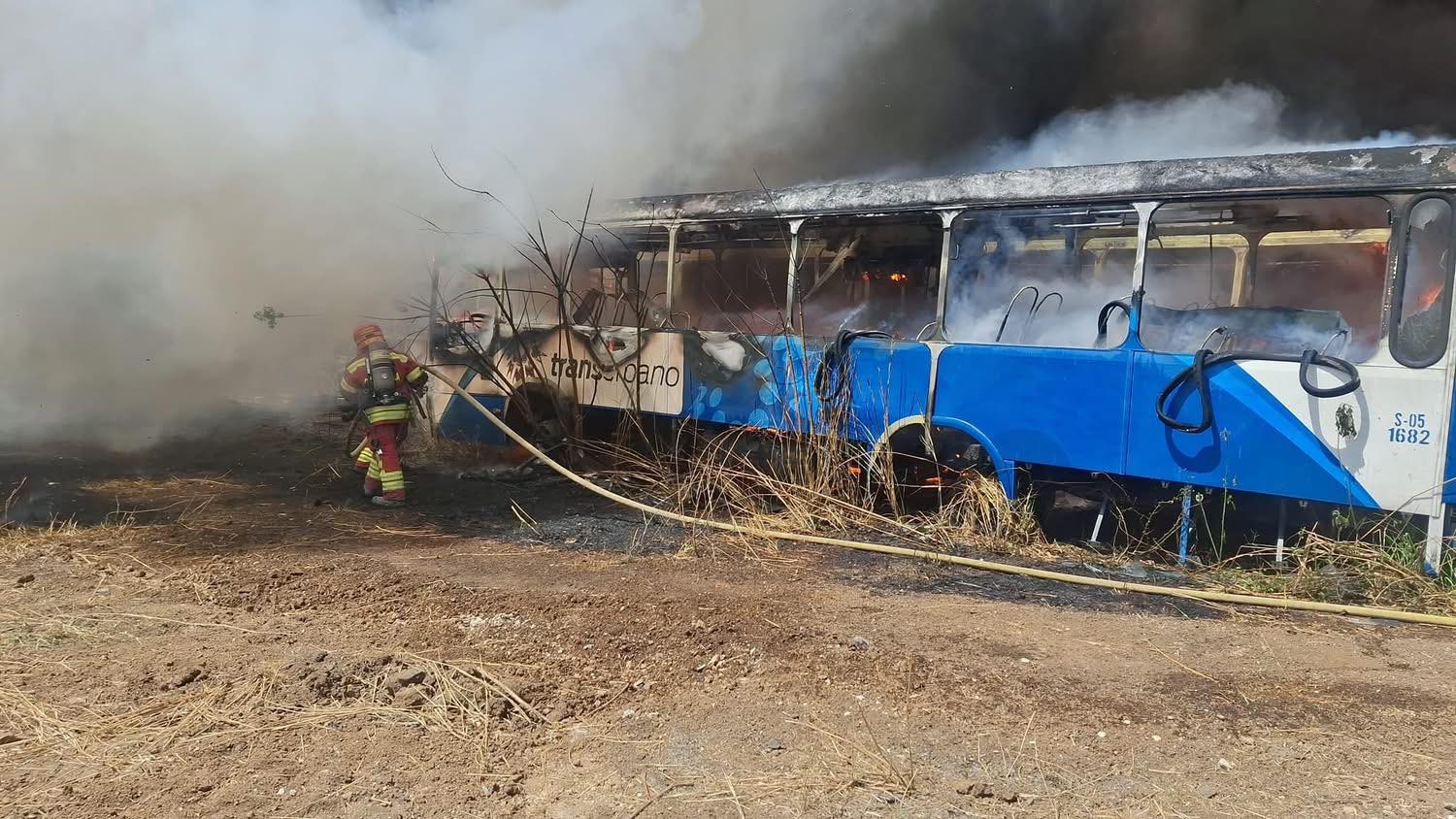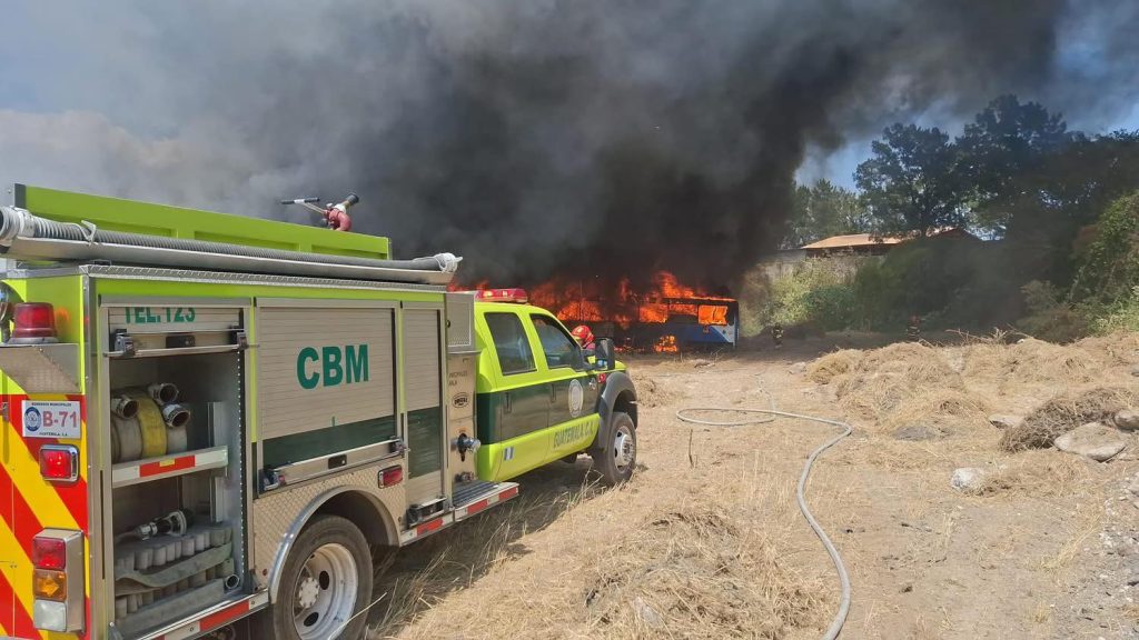 Varios autobuses de la empresa TRANSURBANO se queman esta mañana ante un incendio en el predio ubicado a la altura del kilómetro 14, ruta a Villa Hermosa, zona 7 de San Miguel Petapa.