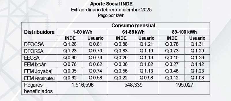 Con el objetivo de apoyar a los guatemaltecos, el Instituto Nacional de Electrificación (INDE) aumentó el aporte social a la tarifa de electricidad para el 2025, informó el presidente Bernardo Arévalo en conferencia de prensa.