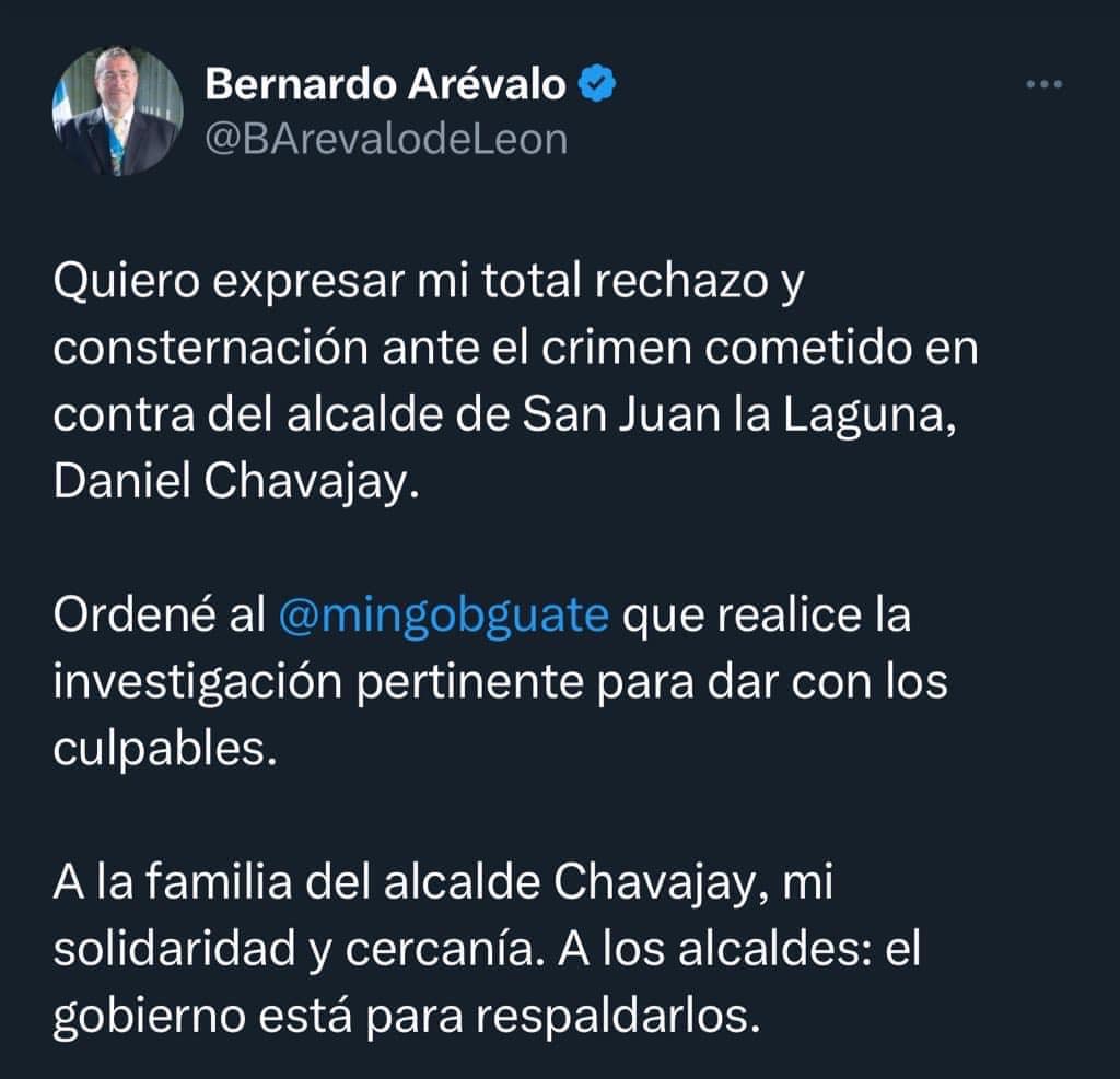Finalmente indica que A la familia del alcalde Chavajay, mi solidaridad y cercanía. A los alcaldes: el gobierno está para respaldarlos