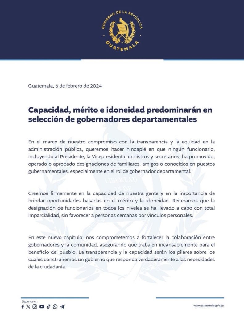Como parte del compromiso con la transparencia y la equidad en la administración pública, el Organismo Ejecutivo hace hincapié en que ningún funcionario, incluyendo al Presidente, la Vicepresidenta, ministros y secretarios, ha promovido, operado o aprobado designaciones de familiares, amigos o conocidos en puestos gubernamentales, especialmente en el rol de gobernador departamental.