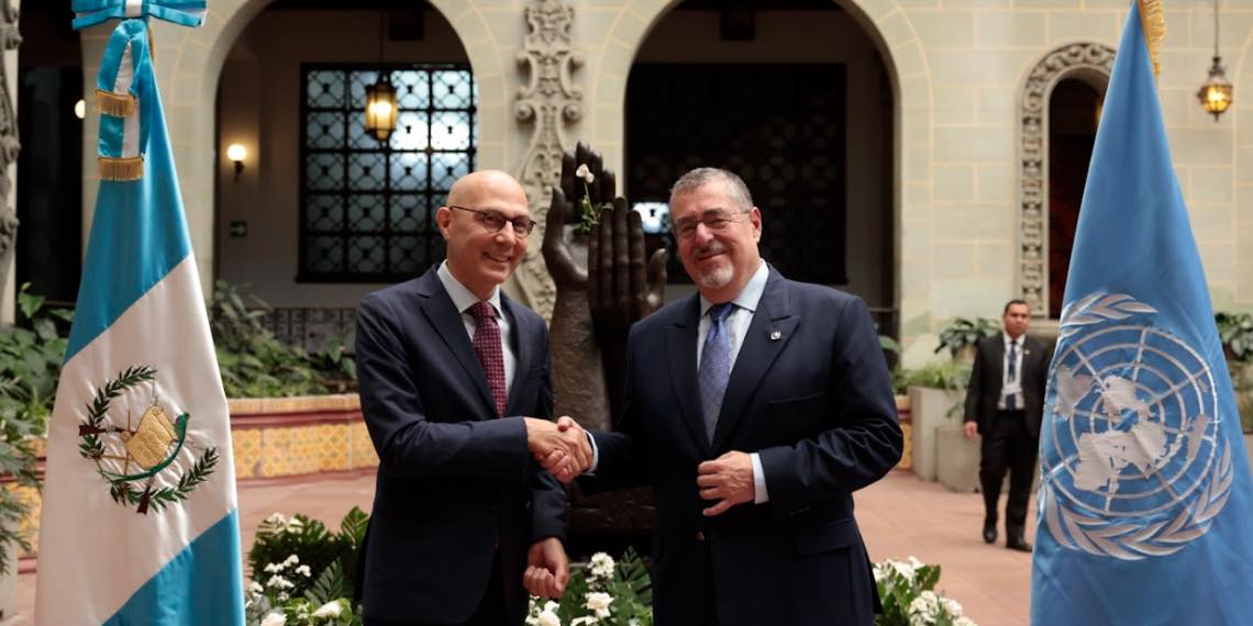 Como parte de la cita de trabajo, el enviado de la ONU posó con el presidente Arévalo ante el Monumento de la Paz, erigido en el patio principal del Palacio Nacional.