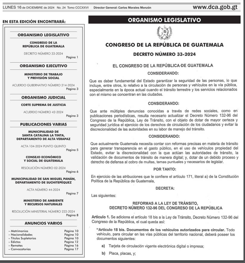 Las reformas a la ley de tránsito que terminará con las multas fantasmas de tránsito fueron publicadas hoy como decreto 33-2024 y entrarán en vigencia el próximo lunes 23 de diciembre cuando las policías municipales de transito ya no podrán abusar con estas multas que socaban la frágil economía de los guatemaltecos.