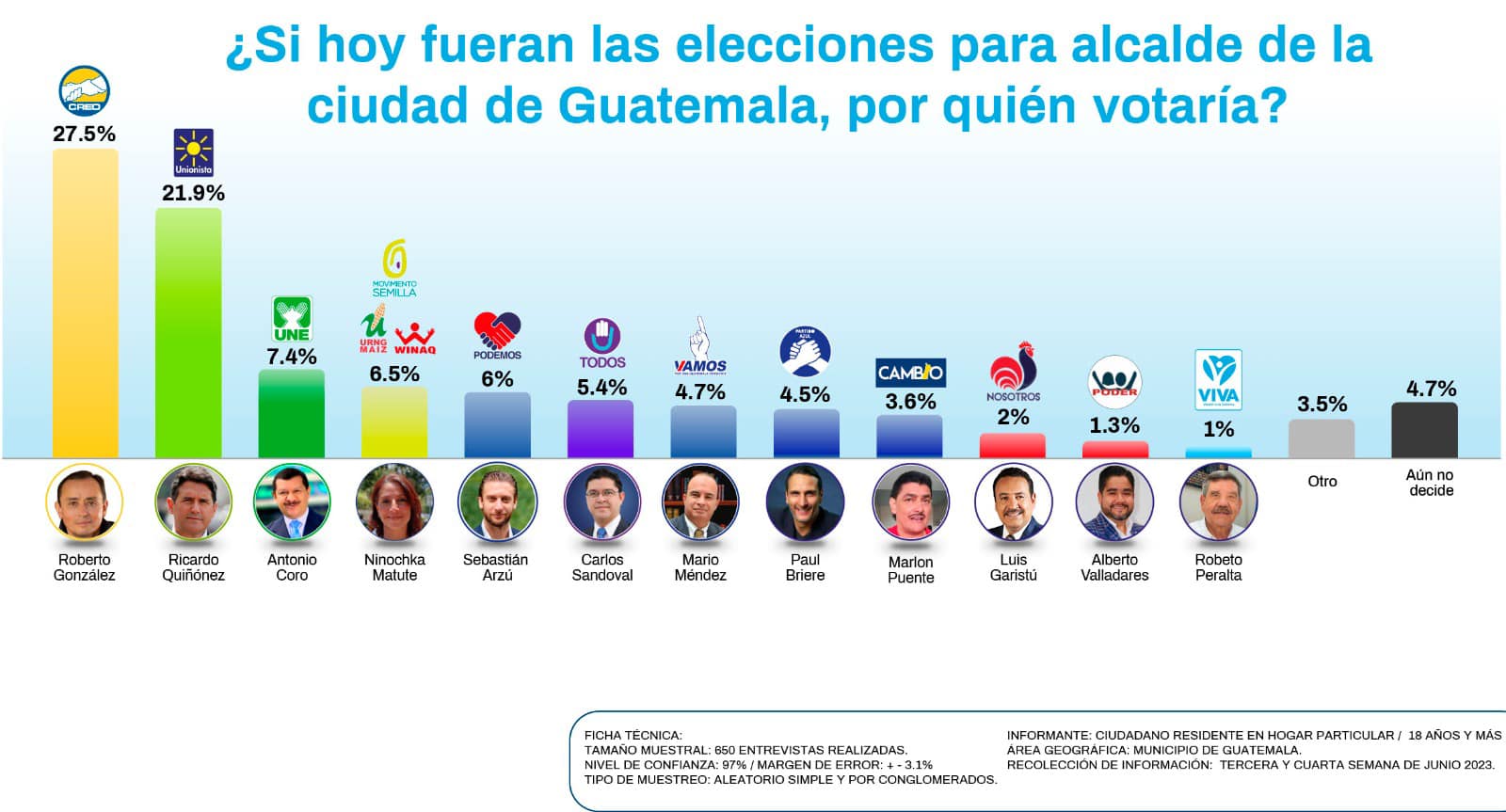 El alcalde capitalino Ricardo Quiñonez, del partido Unionista se derrumba en las encuestas y cae a un 21.9%, mientras que Roberto González del partido CREO incrementa su ventaja y sube a 27.5% según la última entrega de la empresa Con Datos y a tres días de las elecciones generales.