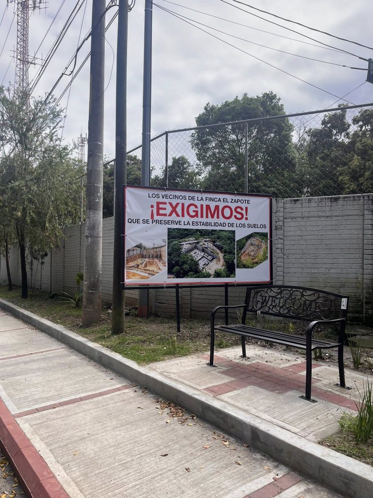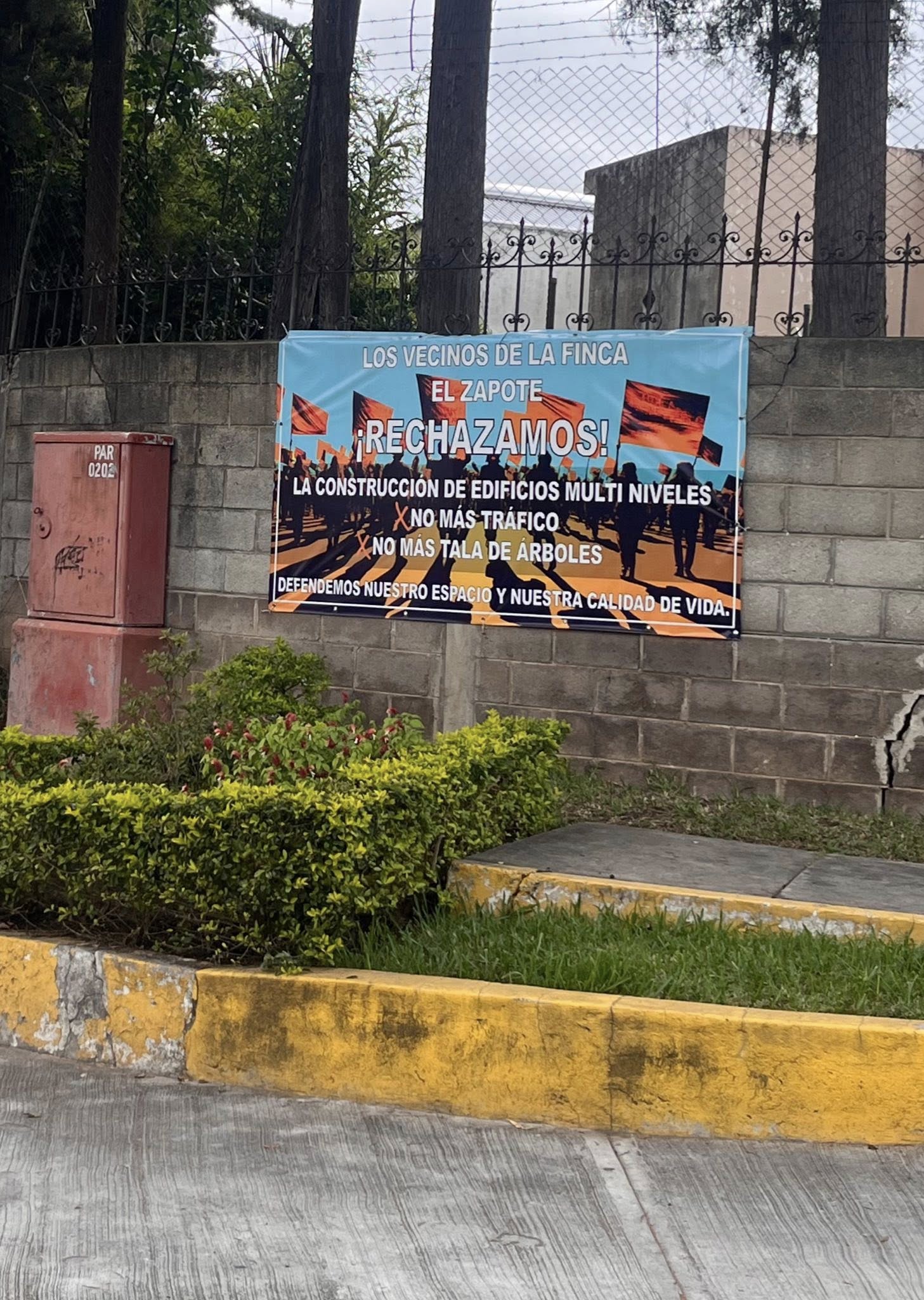 Vecinos de la Finca el Zapote en la zona 2 de la capital cuelgan mantas con su inconformidad por un nuevo edificio que están haciendo, a la orilla del barranco y en un área que era bosque.