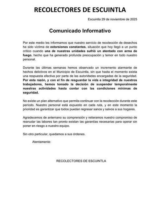 “Nuestro servicio de recolección de desechos ha sido víctima de extorsiones constantes, situación que hoy llegó a un punto crítico cuando una de nuestras unidades sufrió un atentado con arma de fuego, hecho que ha generado profunda preocupación y temor en todo nuestro personal” expresan los recolectores