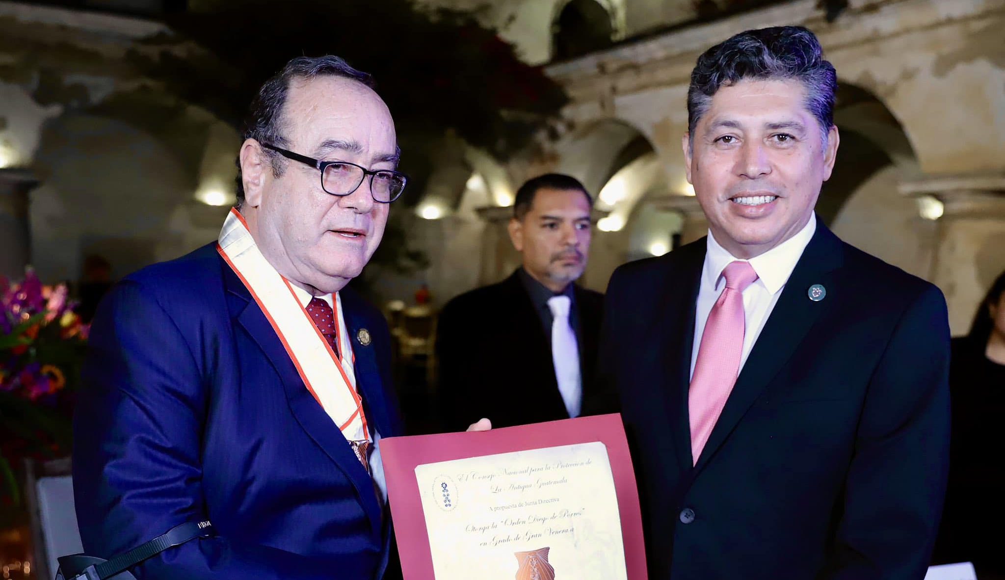 El presidente Alejandro Giammattei recibió este día la Orden Diego de Porres, en Grado de Gran Venera de manos del alcalde de la Antigua Guatemala Víctor Hugo del Pozo , por su contribución a la conservación de la ciudad colonial de Antigua Guatemala.