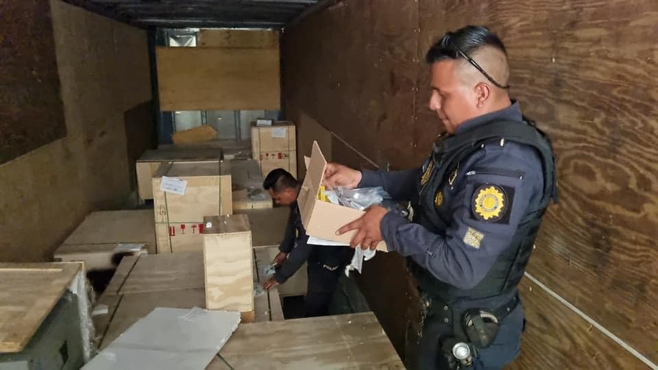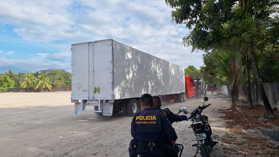En seguimiento a una denuncia, investigadores de la DIP con apoyo de policías de la comisaría de Escuintla, y en coordinación con el Ministerio Público MP , realizaron un allanamiento en un predio ubicado en el kilómetro 70 de la ruta a Taxisco, Santa Rosa, donde localizaron el cabezal con placas salvadoreñas C-85678, marca Freightliner, color blanco, con franjas azul y rojo, modelo 2,000, el cual jalaba un furgón cargado con maquinaria industrial.