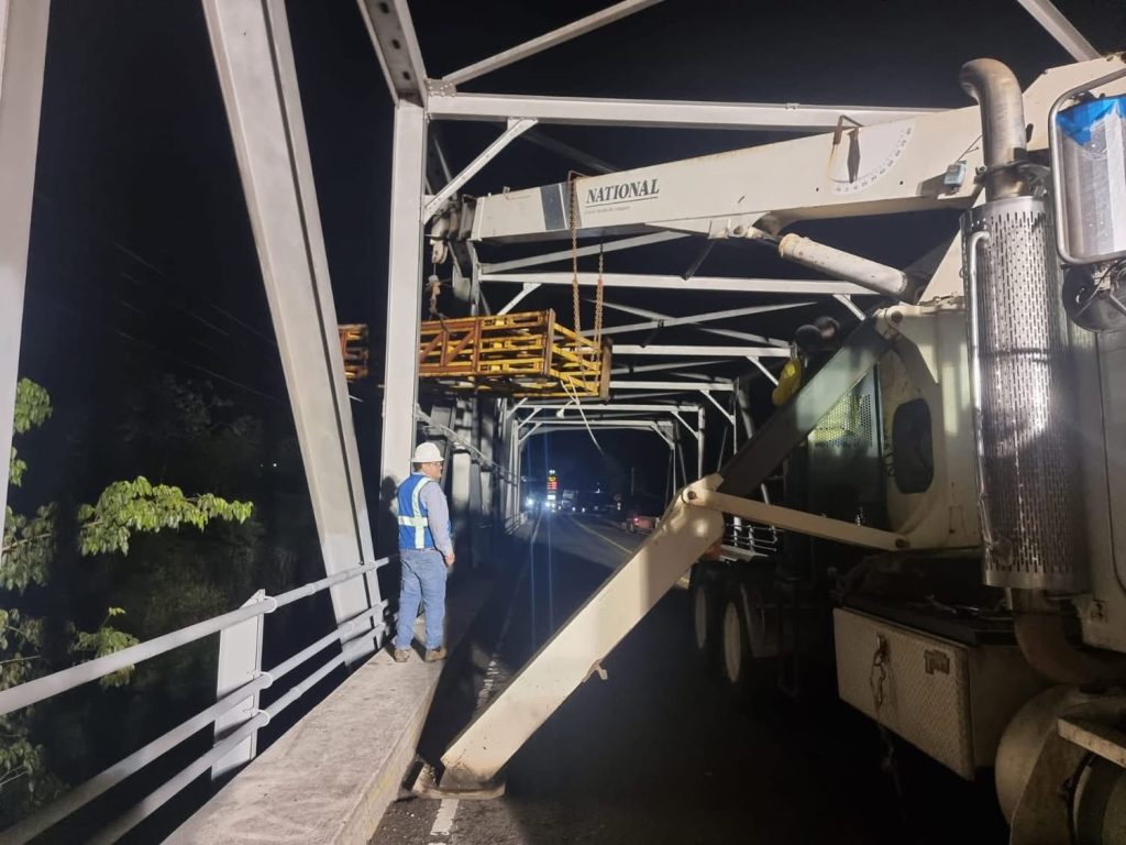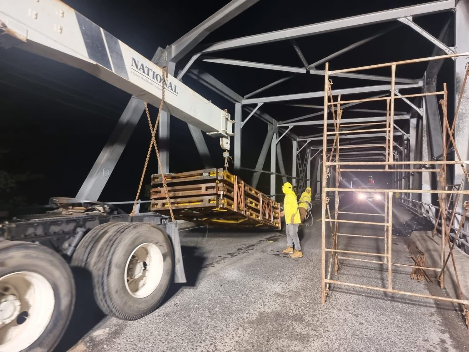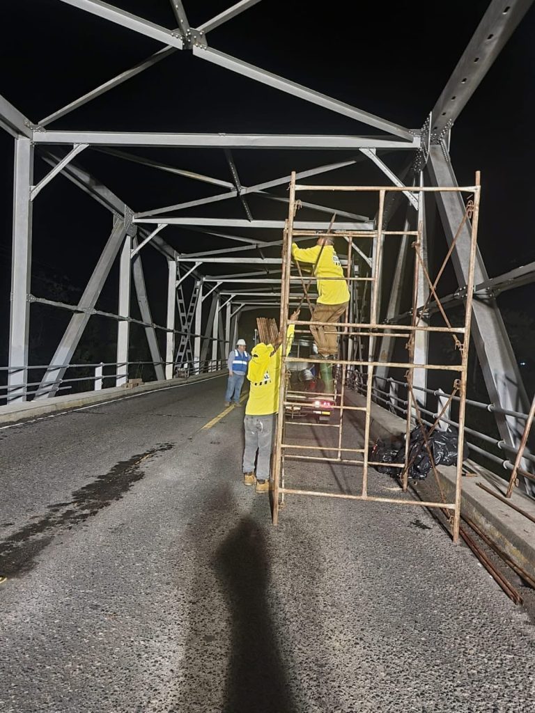 Esta noche personal de la Unidad de Conservación Vial COVIAL efectúan trabajos de reforzamiento de estructura del Puente Iztacapa, ubicado en el km 151.1 de la CA-2 Occidente entre San Bernardino y San Antonio Suchitepequez