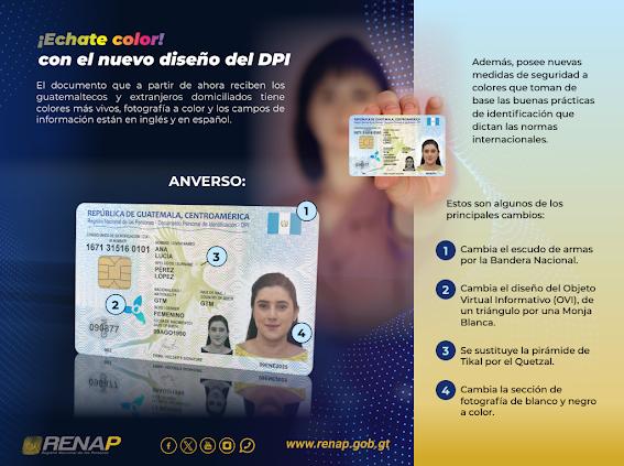 Según el Renap, el nuevo diseño que ahora recibirán los guatemaltecos y extranjeros domiciliados tiene colores más vivos, fotografía a color y los campos de información están en inglés y en español.