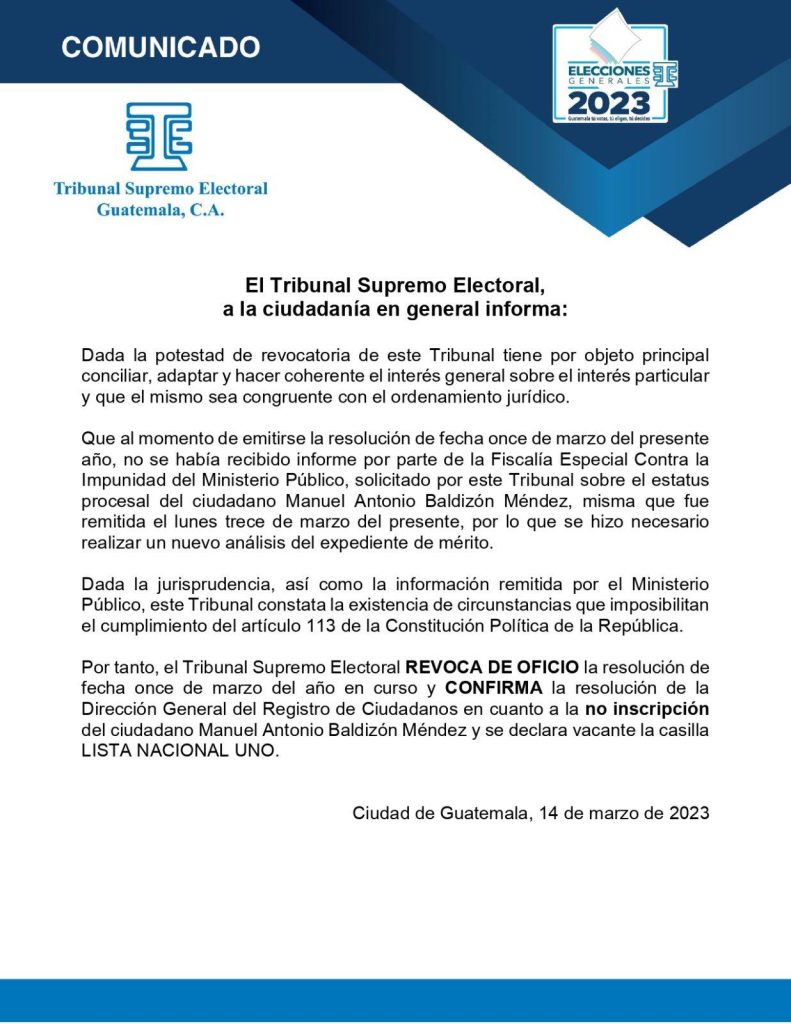 Lo anterior fue expresado en un comunicado en el que señalan que al momento de emitirse la resolución de fecha once de marzo del presente año, no se había recibido informe por parte de la FECI, solicitado por este tribunal sobre el estatus procesal del ciudadano Manuel Antonio Baldizón Méndez, misma que fue remitida el lunes trece de marzo del presente año, por lo que se hizo necesario realizar un nuevo análisis del expediente de mérito.
