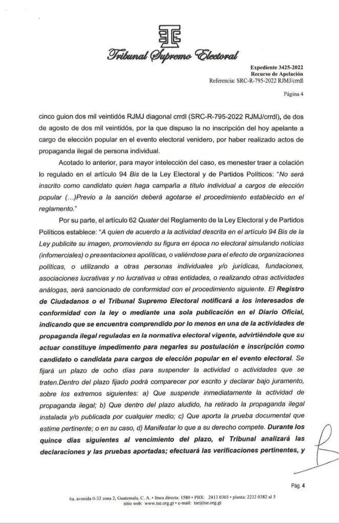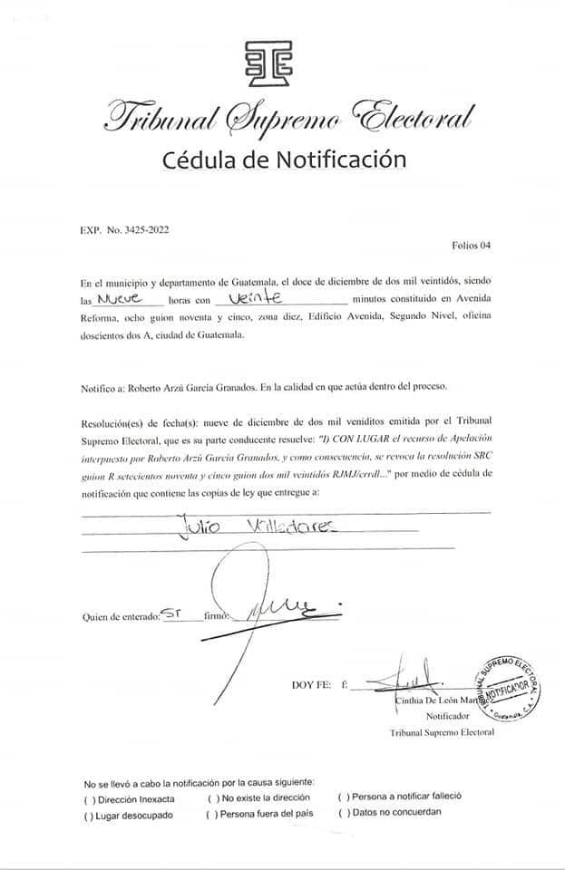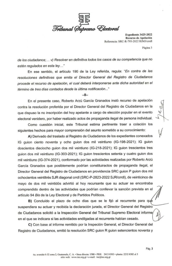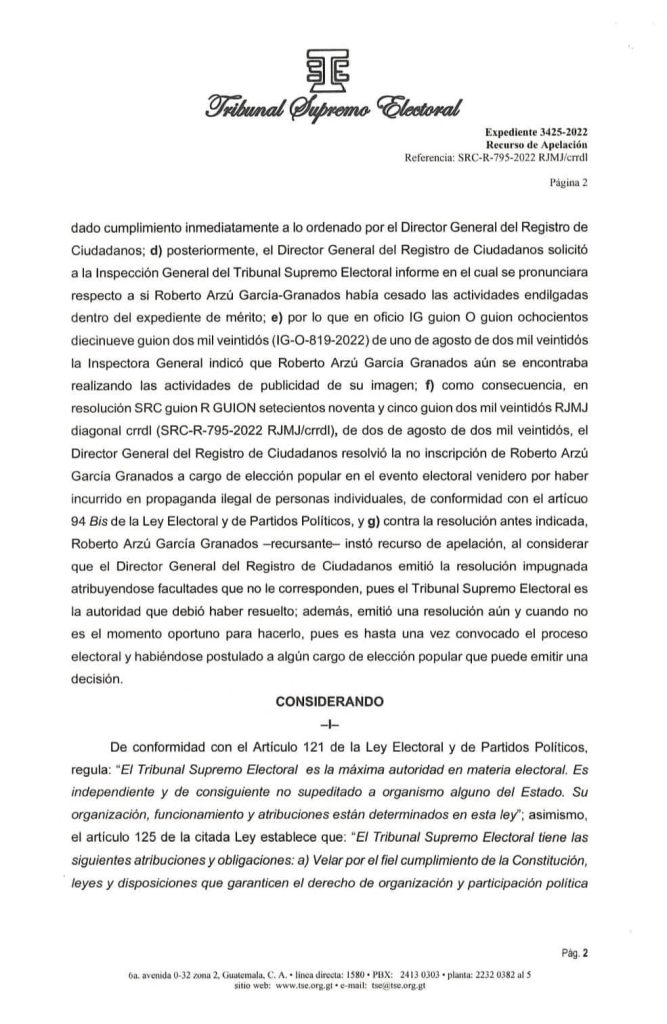 El pasado 2 de noviembre, Arzú García-Granados presentó una apelación ante el Registro de Ciudadanos (RC) del TSE, después de que esta dependencia decidiera no inscribirlo como candidato a un puesto de elección popular para los comicios de 2023.