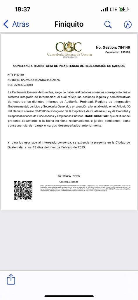 Gándara quien también ocupó el cargo de Ministro de Gobernación en el gobierno de la UNE sin tanta bulla resolvió sus problemas legales para llegar a que el 13 de febrero la Contraloría General de Cuentas le extendiera su finiquito, del cual dio copia a El Periódico El Metropolitano.