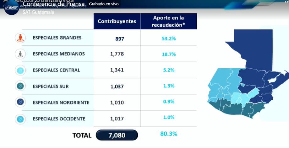 El aporte porcentual de recaudación se basa en cifras hasta noviembre de 2023. Los contribuyentes especiales en Guatemala suman 7 mil 80, que representan el 80.3 % de la recaudación total.
