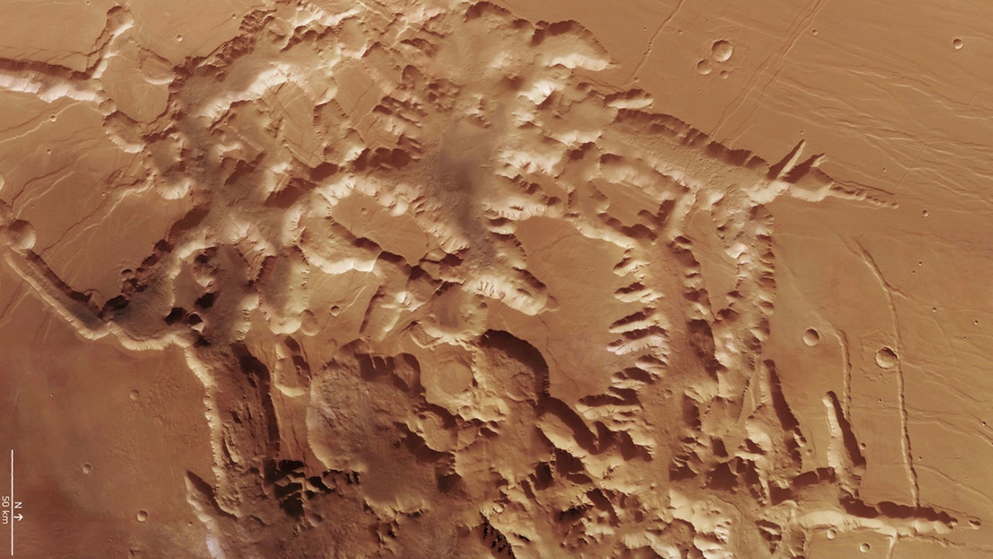 La escurridiza montaña marciana, designada provisionalmente como volcán Noctis, está ubicada en el límite entre el ‘Noctis Labyrinthus’ y los monumentales cañones de ‘Valles Marineris’. Su altura asciende a más de 9.000 metros y se extiende por 450 kilómetros de ancho.