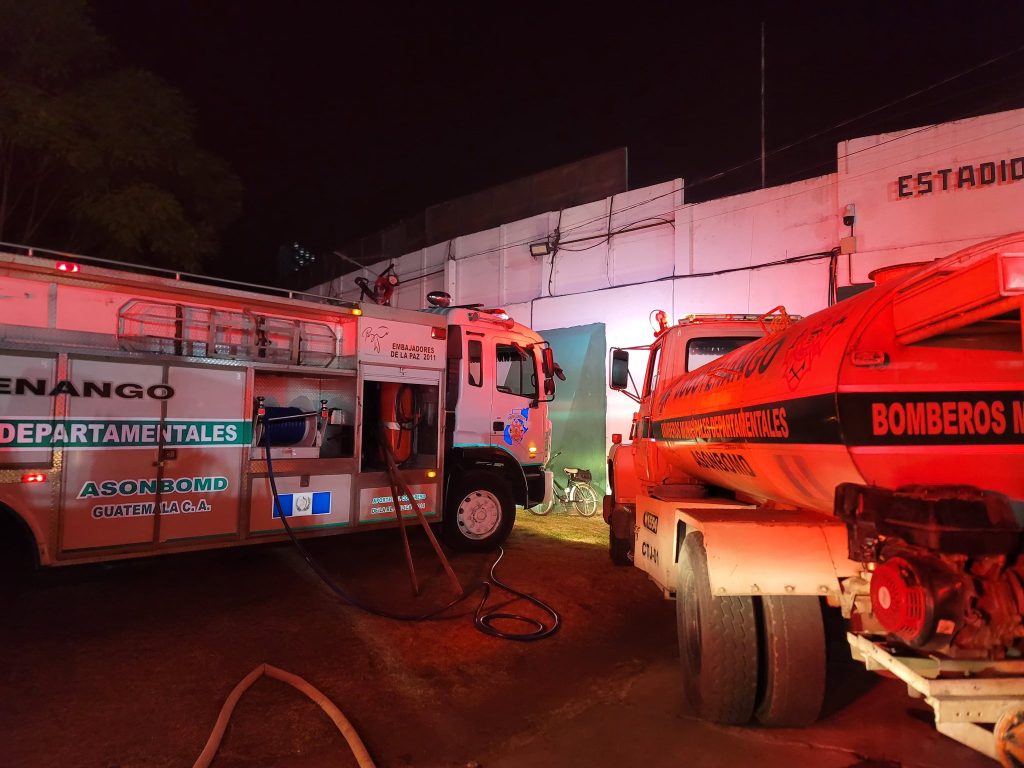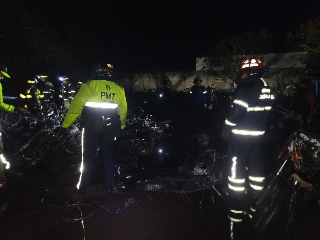 A un costado del estadio Pensativo de la Antigua Guatemala, en un predio de la Policía Municipal de Transito PMT, se registra la noche de este viernes un incendio el cual consume varias motocicleta.