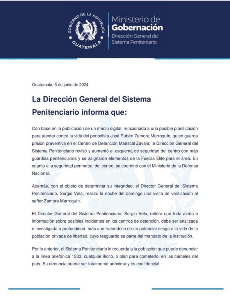 La Dirección General del Sistema Penitenciario (DGSP) ha tomado medidas para fortalecer la seguridad en el Centro de Detención Preventiva Mariscal Zavala, donde permanece recluido José Rubén Zamora Marroquín. La DGSP tomó esta decisión luego de que en un medio digital se conoció sobre un posible atentado contra la vida del periodista, informó esa institución en un comunicado.