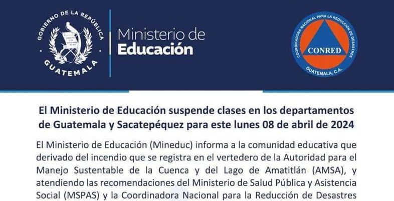 También indica que de acuerdo con el reporte del Instituto Nacional de Sismología, Vulcanología, Meteorología e Hidrología (INSIVUMEH), la calidad del aire se encuentra en niveles dañinos a la salud y como medida de prevención y resguardando la salud de los niños, las niñas, los adolescentes y los jóvenes, se suspenden las actividad escolares para el lunes 08 de abril de 2024”