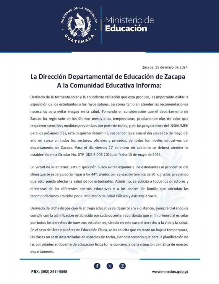 “Este despacho determina, suspender las clases el día jueves 16 de mayo del año en curso en todos los sectores, oficiales y privados, de todos los niveles educativos del departamento de Zacapa” expresa el comunicado
