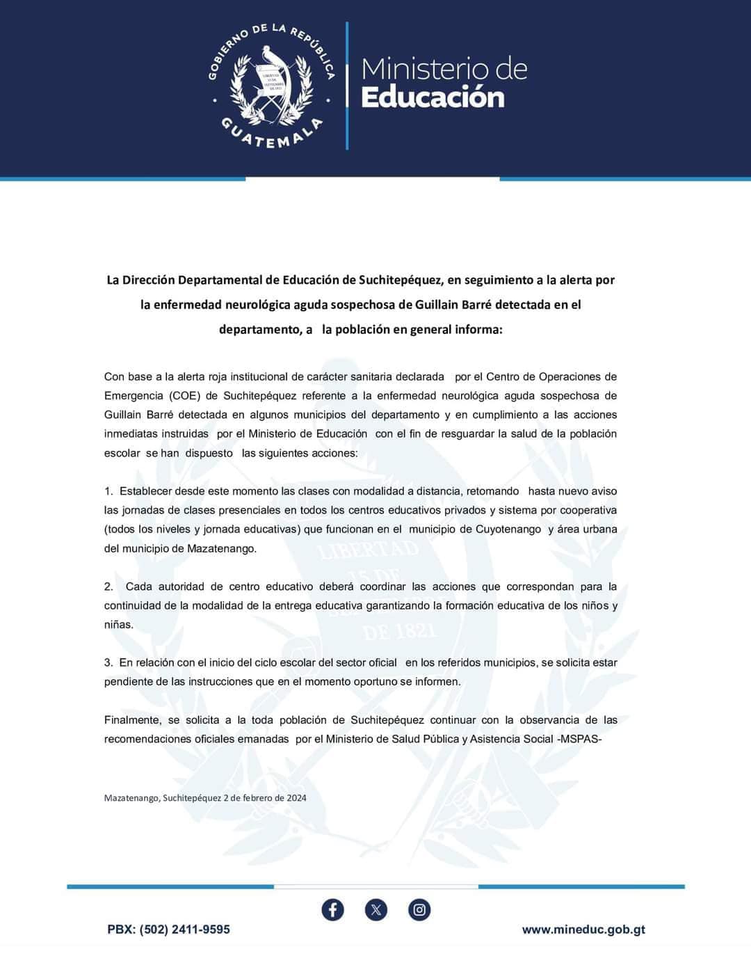 En un comunicado de prensa expresa que “Con base a la alerta roja institucional de carácter sanitaria declarada por el Centro de Operaciones de Emergencia (COE) de Suchitepéquez referente a la enfermedad neurológica aguda sospechosa de Guillain Barré detectada en algunos municipios del departamento y en cumplimiento a las acciones inmediatas instruidas por el Ministerio de Educación con el fin de resguardar la salud de la población