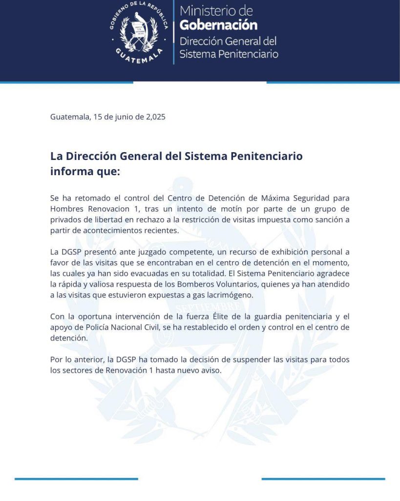 La Dirección General del Sistema Penitenciario DGSP suspende en su totalidad las visitas “hasta nuevo aviso” para todos los sectores en la cárcel Renovación 1 en Escuintla luego del amotinamiento de la noche de este domingo