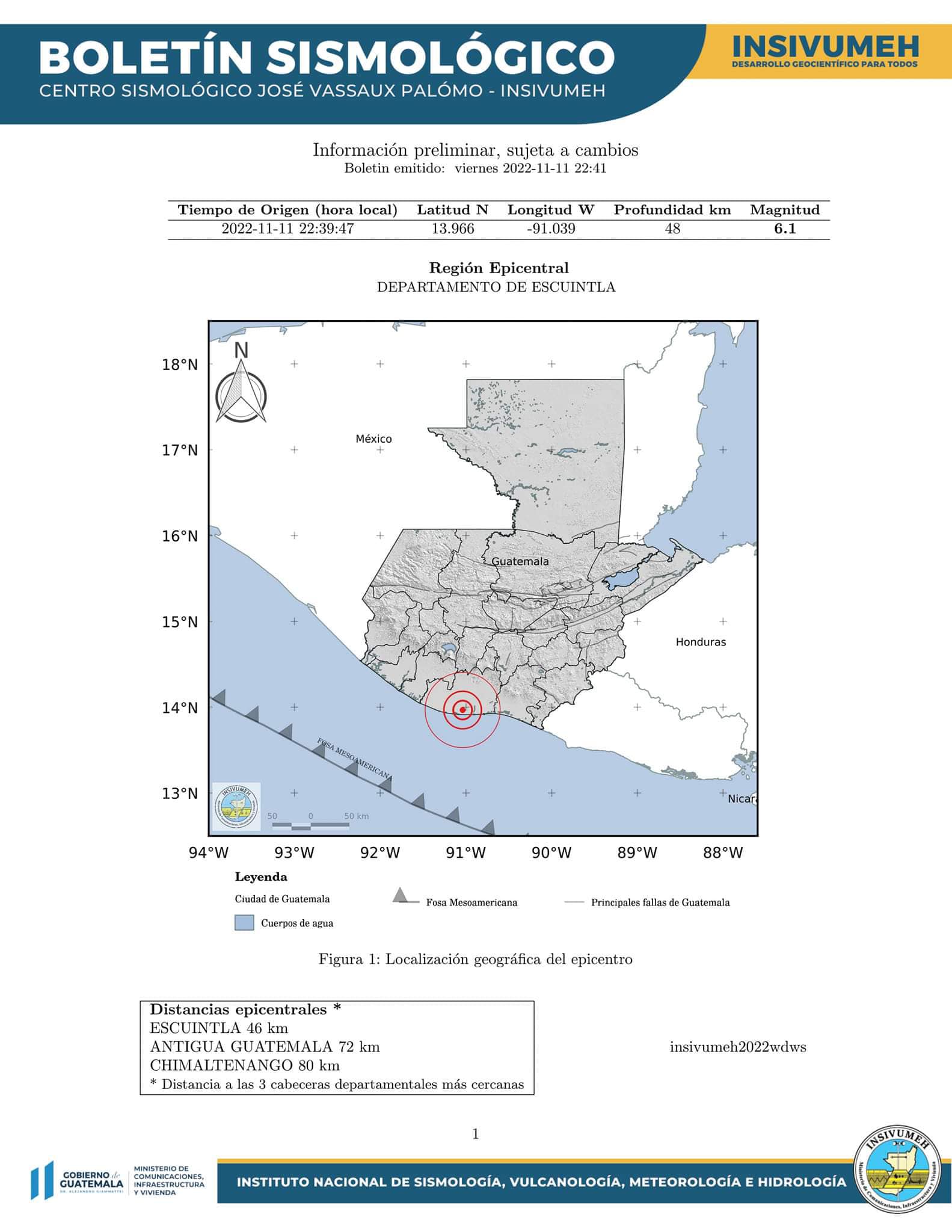 TEMBLOR CON EPICENTRO EN ESCUINTLA…A las 22:39 horas se registró un sismo de magnitud 6.1, región epicentral: departamento de Escuintla.